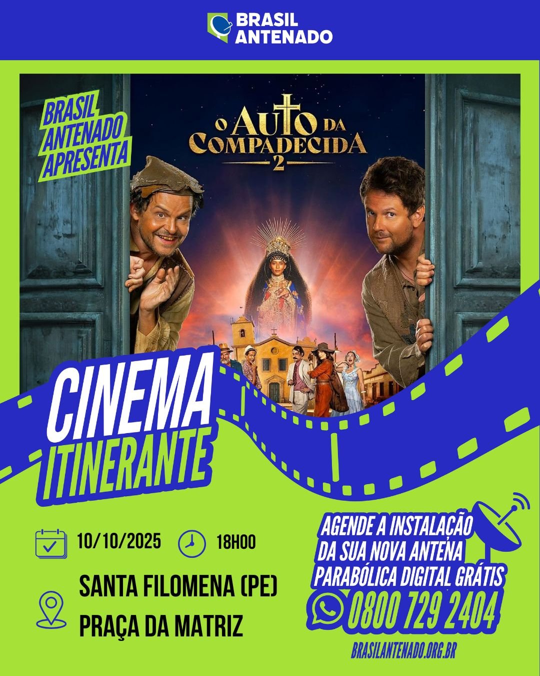 Santa Filomena-PE será o próximo destino do programa Brasil Antenado, que chega ao município no dia 10 de outubro com a ação do cinema itinerante, uma iniciativa que une cultura, entretenimento e informação para famílias de baixa renda. A ação também passará por Santa Cruz da Venerada, no dia 9, e segue para Dormentes, no dia 11 de outubro.